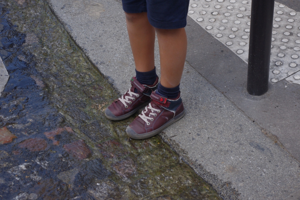 Le calme est revenu. Quelques sirènes déchirent parfois le silence. L’enfant descend au salon. Ses parents si sombres ce matin ne sont pas là. Un poste TSF crache des informations que son jeune cerveau ne peut intégrer. Il se prépare une tartine de pain avec de la marmelade d’orange. L’amertume de son goûter renforce son inquiétude, il veut comprendre. Bravant l’interdit il sort dans la rue. Sur le trottoir ses chaussures l’arrêtent net.