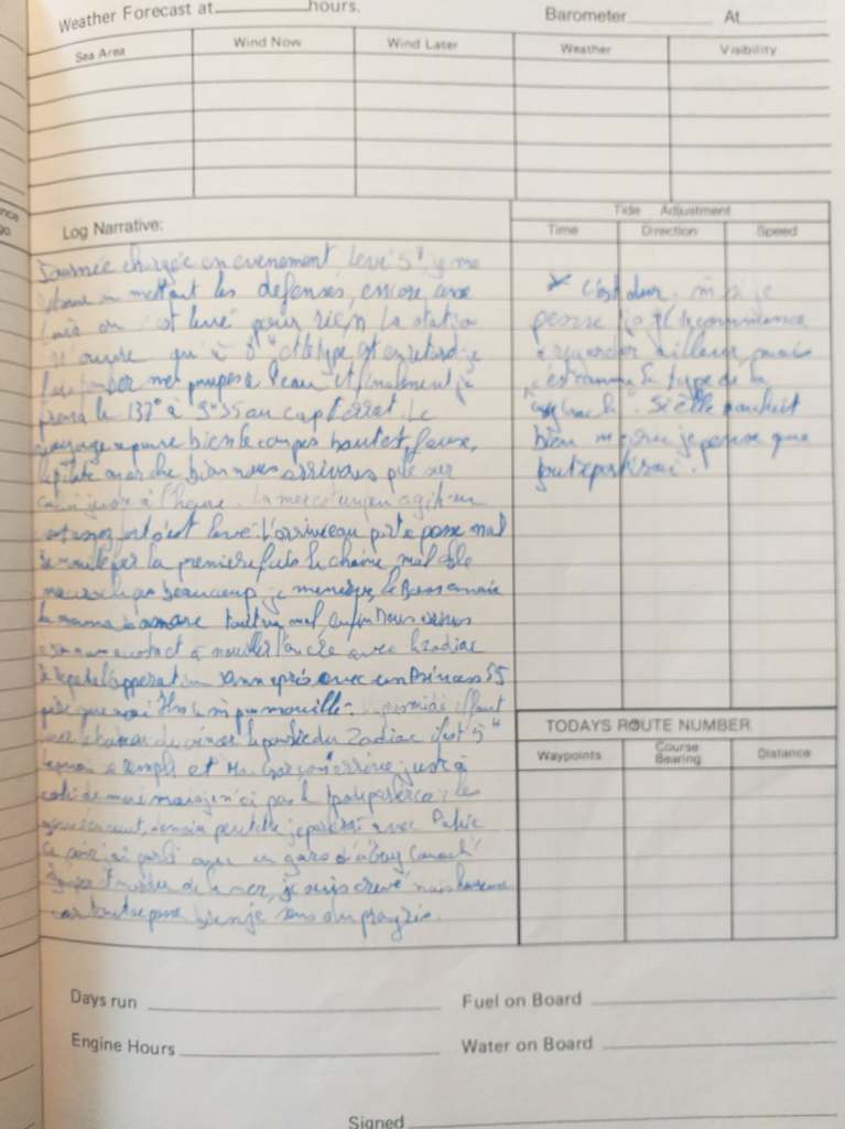 Ce soir j’ai discuté avec un gars sur une « Guy Couach ». Sympa et mordu de mer. Je suis crevé mais heureux car tout se passe bien. Je sens du progrès.