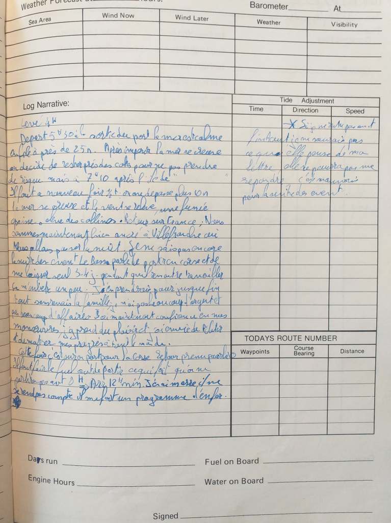Retour sur la France. Nous sommes maintenant bien ancrés à Villefranche sur Mer où nous allons passer la nuit. Je ne sais pas encore la suite des événements. Le Boss parle de partir en Corse et de me laisser seul trois ou quatre jours pendant qu’il rentre travailler. Ca m’embête un peu. J’en prendrais jusque fin Août. Le tout sans revoir la famille. Je n’ai plus beaucoup d’argent et peu d’affaires.